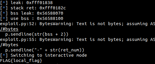 스택 주소 하나 릭해서 ret주소가 저장된 스택주소를 v1에 저장하고 fsb를 통해 하위 1byte만 조작해서 ret가 win함수가 되도록했다