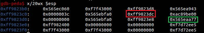 빨간색 표시가 scanf로 입력한 값이고 초록색 표시가 ret주소다