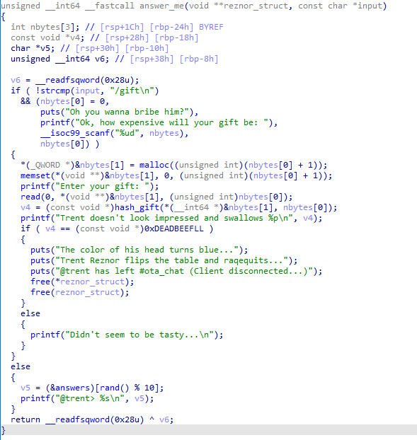 위 함수에서는 수와 문자열을 입력 받고 hash_gift함수의 반환 값이 0xdeadbeef가 되면 reznor에서 할당된 청크들을 해제한다
