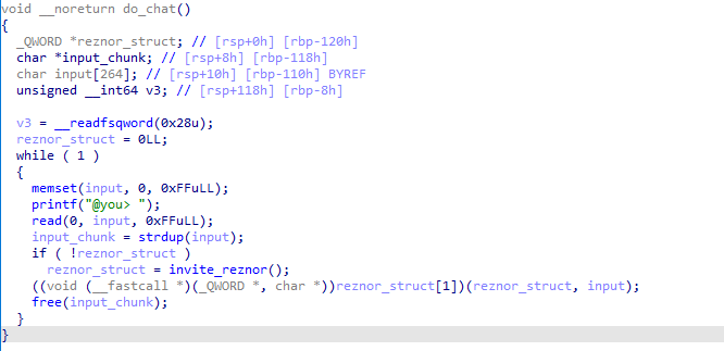 initvite_reznor함수에서는 힙을 할당 받고 0에는 문자열이 저장된 힙 주소를 저장하고 +8에는 answer_me함수의 주소를 저장한다