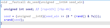 하지만 do_seed함수에는 srand을 설정할 때 win함수의 1byte 값을 가지고하기 때문에 1byte srand에 해당하는 고정된 rand값을 알 수 있기 때문에 이를 릭해낼 수 있다