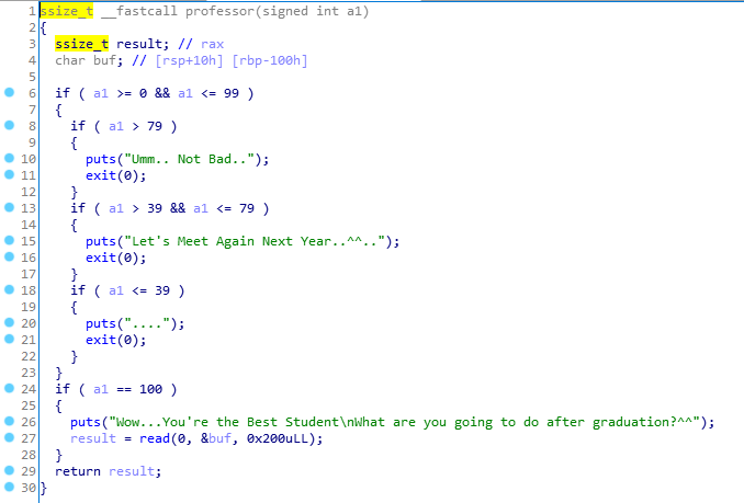 professor함수에서는 a 1가 100 이점 read함수를 통해 BOF가 발생하게 됩니다