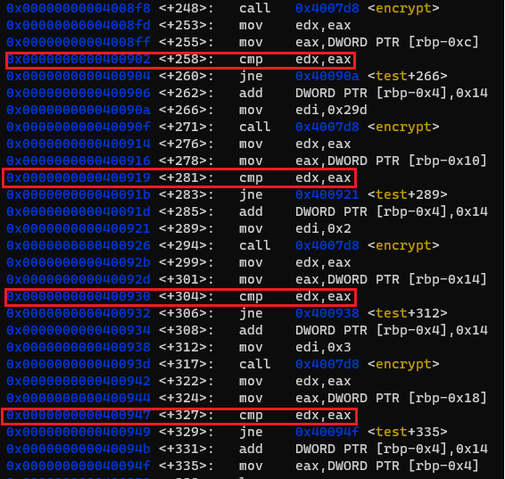 하지만 encrypt함수 이후에 비교가 이루어지기 때문에 eax에 들어가 있는 정수만 확인해주면 굳이 encrypt함수에서 수행하는 연산을 하지 않고도 값을 알아낼 수 있습니다