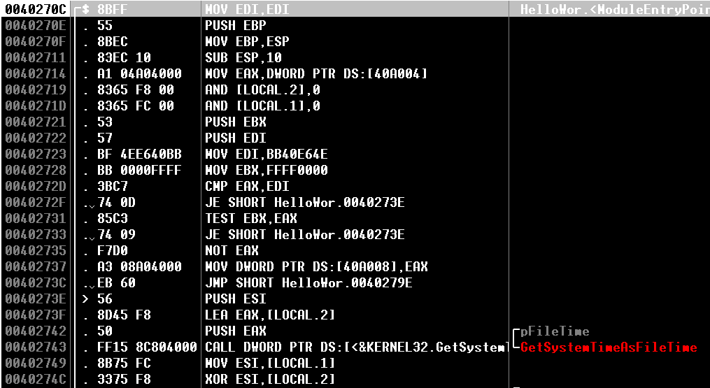 CALL명령어를 통해 따라 들어간 함수가 main함수인지는 함수 내에 MeassageBox함수 유무를 통해 main함수인지 구분할 수 있다. ( helloworld 소스코드 참고 )