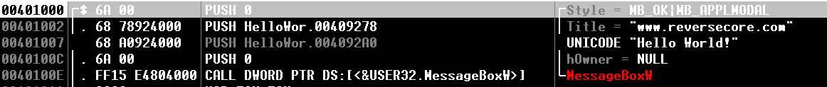 여기서 호출되는 함수 명령어를 따라 디버깅을 하다 보면 00401144 주소에 CALL명령어로 이동한 00401000 주소에 MessageBox() 함수를 찾을 수 있다.