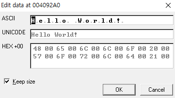 Hello World! 문자열은 004092A0 ~ 004092B4 영역을 차지한다.