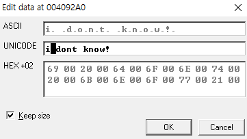 덤프 창에서 [Ctrl + G] ( goto 명령)을 통해 004092A0주소를 통해 이동한 후 [Ctrl + E]를 통해 문자열을 수정하면 된다.