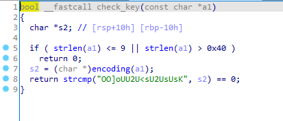 check_key함수를 보면 encoding함수 호출 후 strcmp함수를 통해 문자열과 비교하여 같고 그때 반환 값인 0이 면 1(True)을 반환하게 됩니다