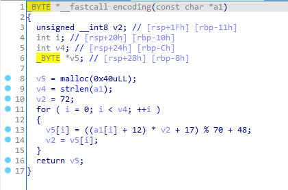 encoding함수의 경우 일련의 연산을 수행하게 됩니다 여기서 a1[i]가 입력한 문자열이고 v2의 초기 값은 72이고 첫 연산 이후 encode 된 값이 들어갑니다