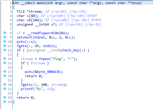 main함수를 보면 check_key함수에 입력한 문자열이 들어가고 반환 값이 1이면 되면 플레그를 출력해줍니다