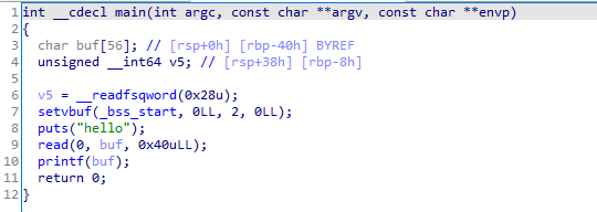 해당 문제는 HackCTF의 babyfsb문제입니다 x64bit 바이너리이고 0x40만큼의 데이터를 read함수로 입력받고 printf함수를 통해 buf 배열을 그대로 출력해줌으로써 fsb가 발생합니다