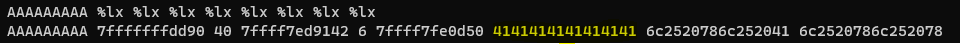 입력한 데이터의 위치를 확인하기 위해 %lx형식으로 총 8번 뒤의 데이터를 leak한 후의 결과입니다