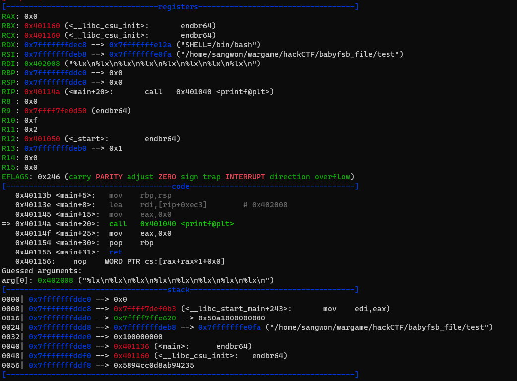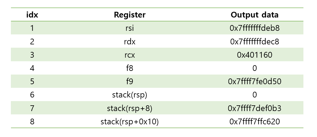 위의 코드에서 %lx형식이 총 8번 출력을 하게 되고 printf가 실행되기 직전의 레지스터와 스택의 상태입니다