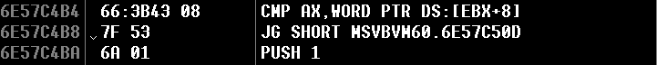 EBX + 8에는 4 값이 들어가 있고 AX의 값이 4보다 크면 점프하게 되고 그렇지 않으면 1을 PUSH한뒤 함수를 종료하게 됩니다. ( EAX 값은 1이 저장됩니다. )