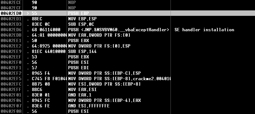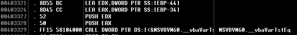 그럼 vbaVarTstEq() 함수에서 입력한 문자열을 비교할 것이라고 유추할 수 있고 vbaVarTstEq() 함수 위에 오는 PUSH 명령어 EDX, EAX 2개는 함수의 파라미터가 될 것입니다.