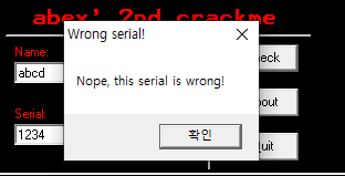 이문제에서의 목표는 crackme1과 같이 성공 메시지 박스가 출력되도록 하는 것과 올바른 시리얼 번호를 찾는 방법입니다.