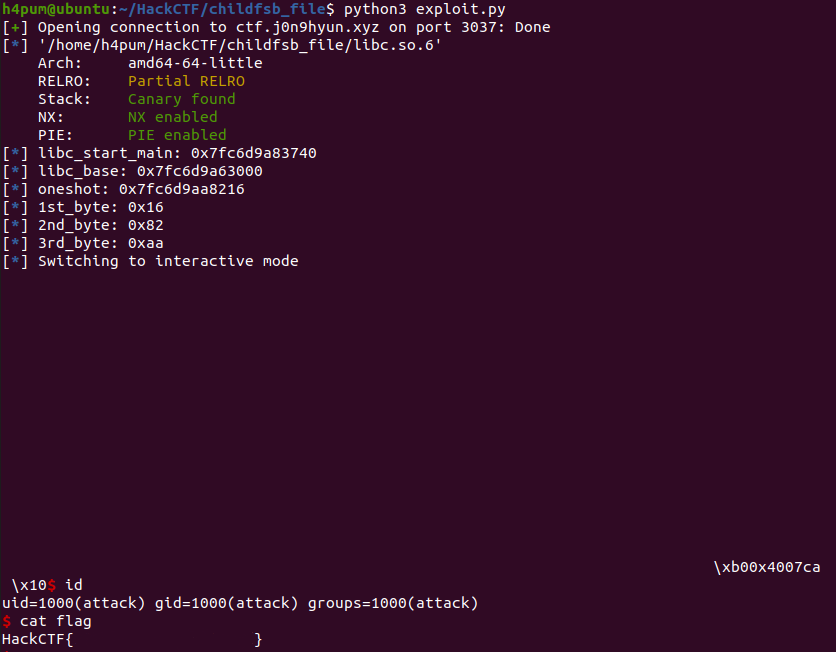 첫 fsb에서는 libc_start_main함수 leak하고 stack_chk_fail함수 2byte overwrite해서 다시 main으로 가도록 했다