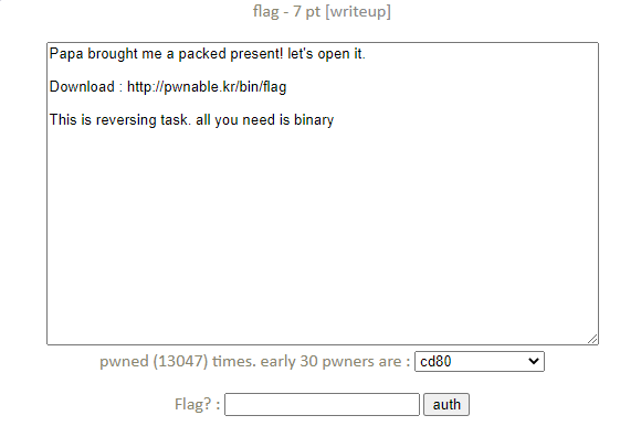 pwn/pwnable.kr flag lok2h4rd 2022. 3. 23. 18:24 problem flag UPX로 패킹된 바이너리 풀고 main함수에서 플래그를 얻었다 공유하기 게시글 관리 lok2h4rD 'pwn > pwnable.kr' 카테고리의 다른 글 random (0) 2022.03.23 passcode (0) 2022.03.23 bof (0) 2022.03.23 collision (0) 2022.03.23 fd (0) 2022.03.23 'pwn/pwnable.kr' Related Articles random passcode bof collision